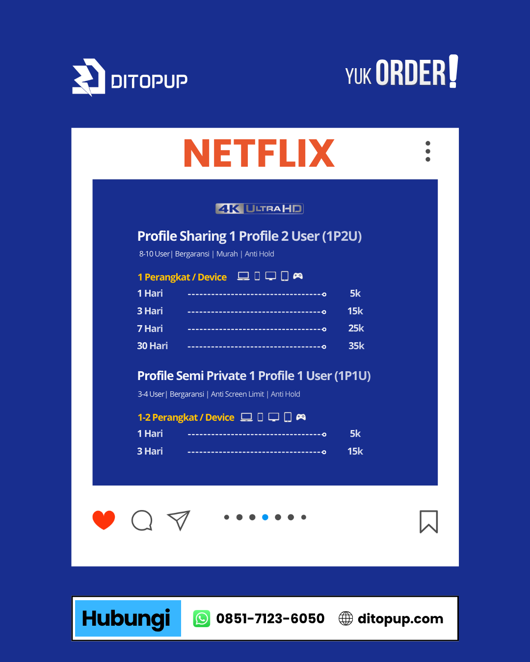 Daripada buang duit ratusan ribu, mending pakai solusi paling pinter: Beli Langganan Netflix Premium (Kualitas 4K Ultra HD) di Ditopup.com! Nggak perlu komitmen panjang, harganya super murah meriah, bergaransi, dan pembayarannya gampang banget (bisa QRIS, DANA, GoPay).